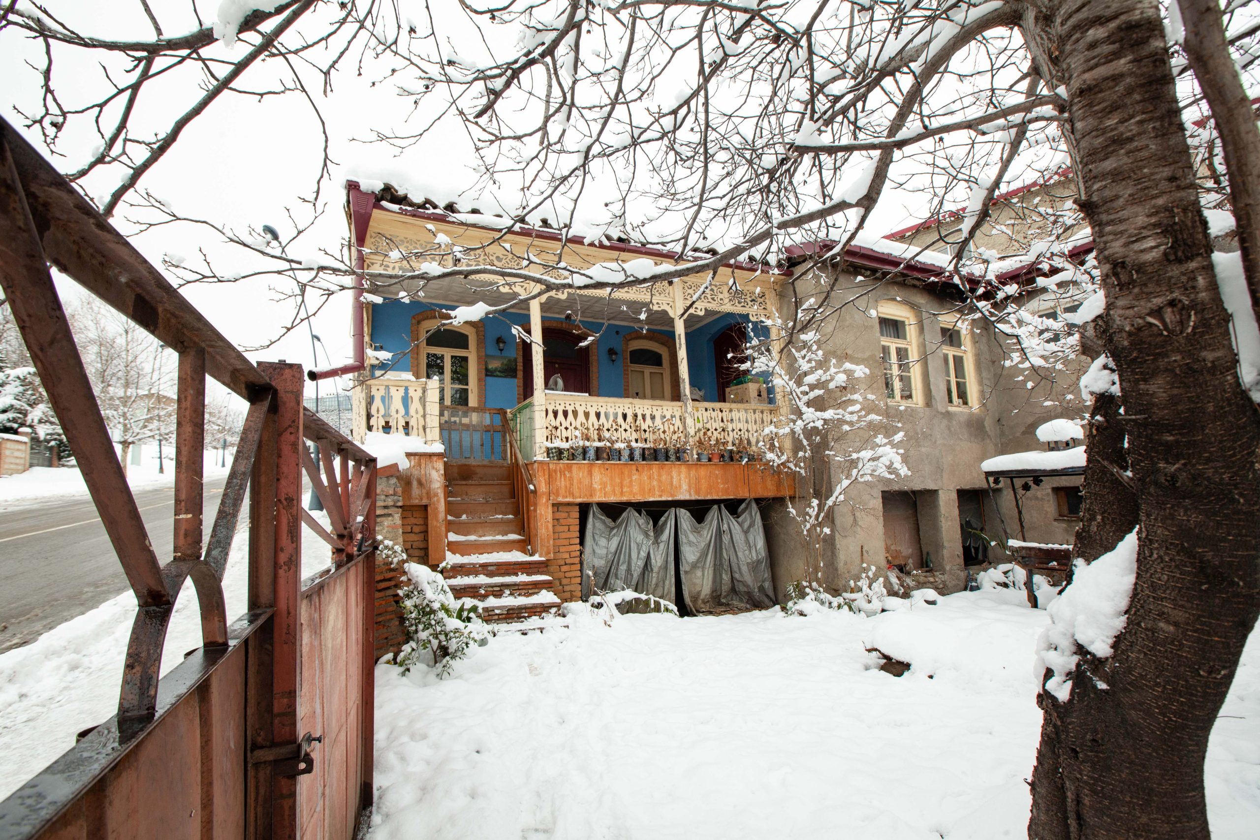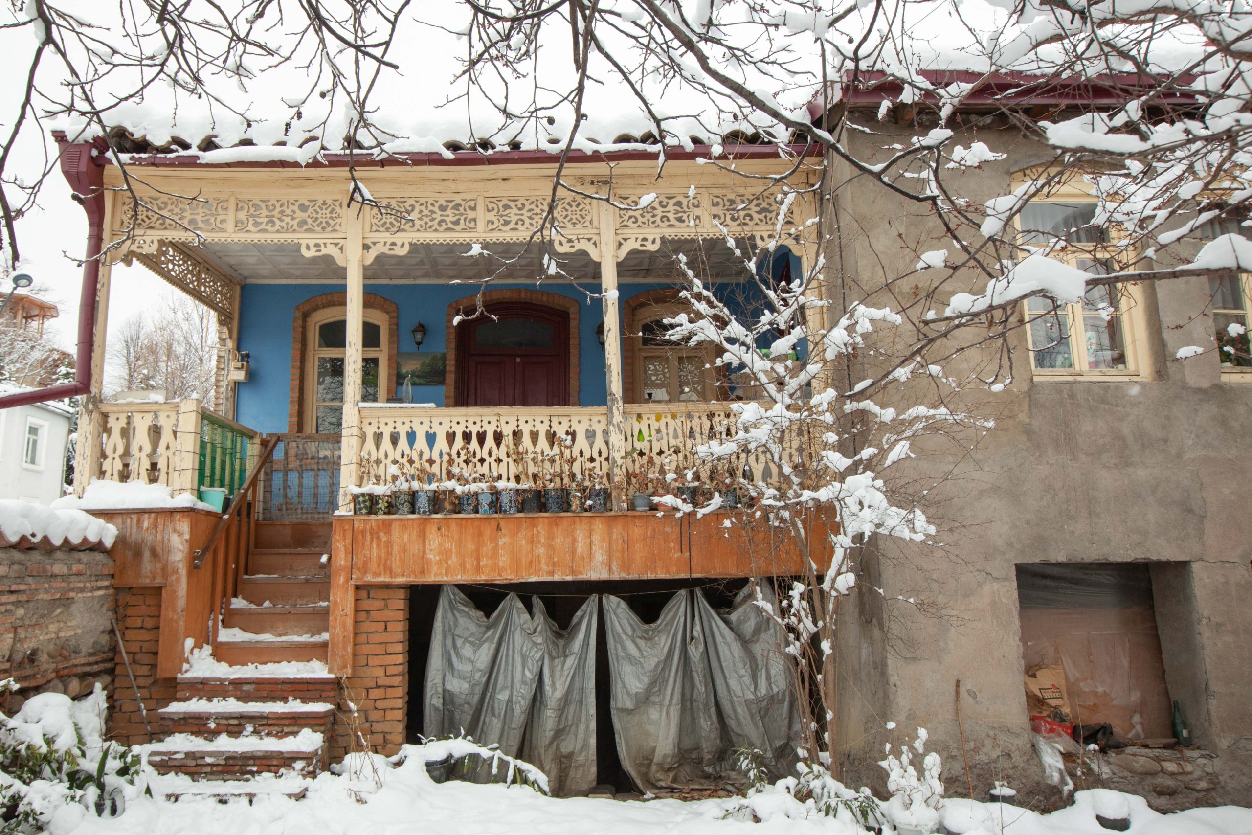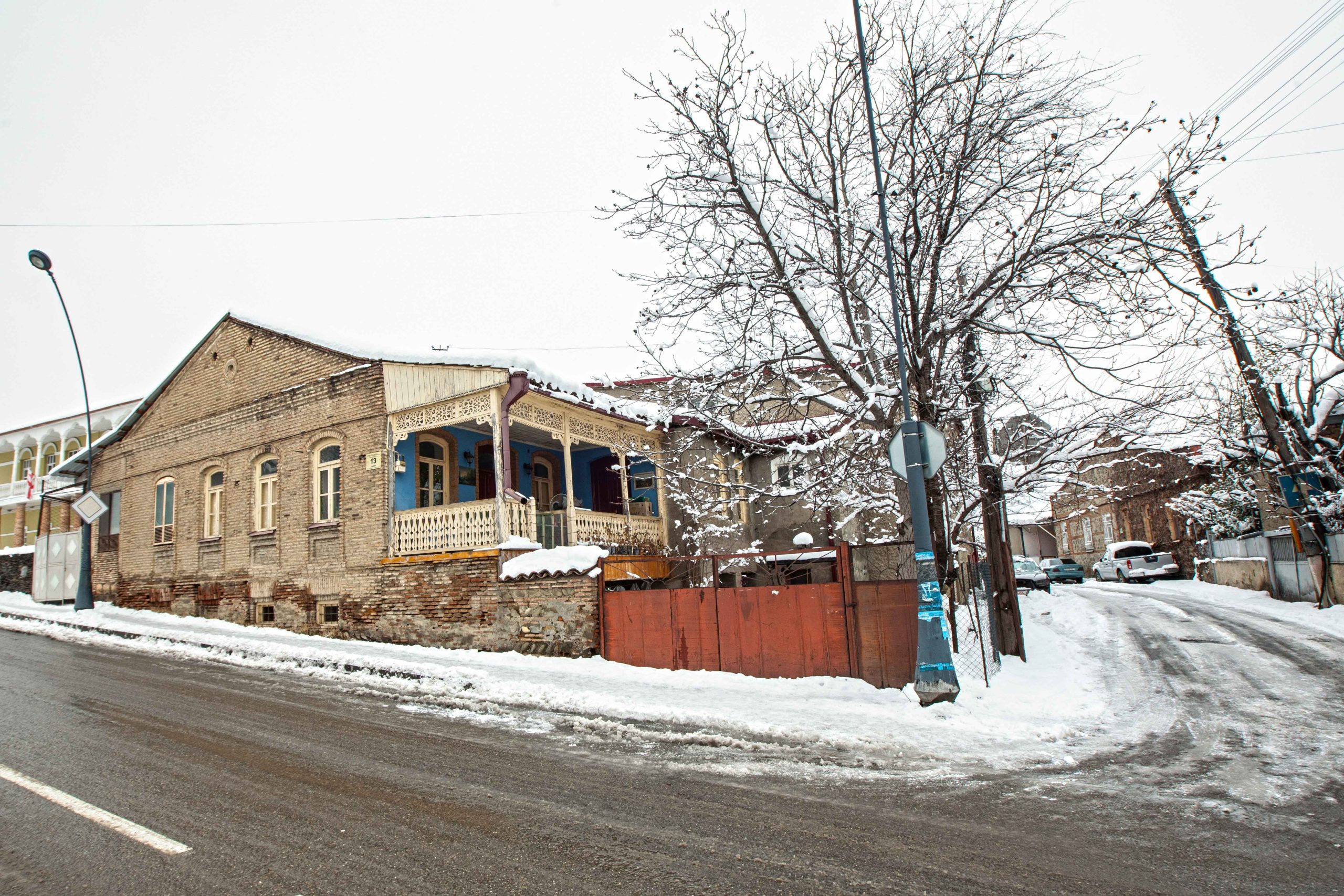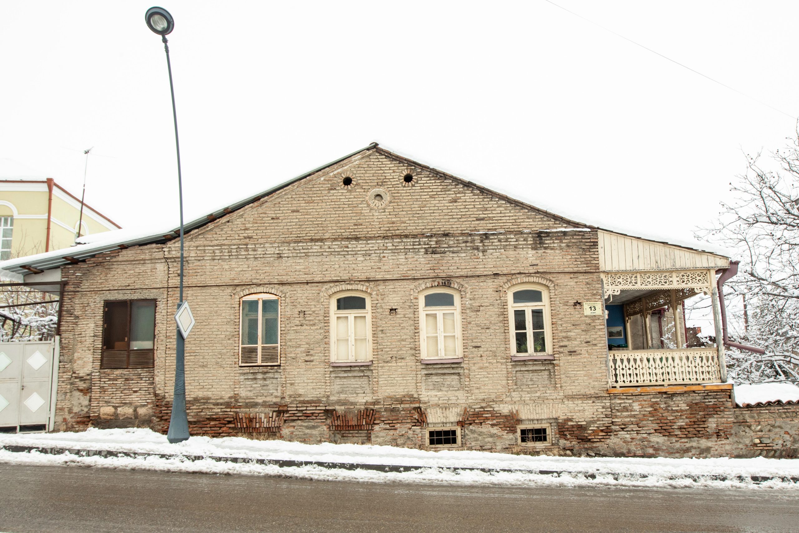 A typical “Telavian” house with a high pediment, built of brick, organically combines with the complex terrain and harmoniously fits into the existing development. The facade from the street attracts attention with an overhanging wooden openwork balcony, and the street facade – with an ordered brick masonry and a rhythmic arrangement of flat-archways. In the interior of the house, old wooden doors and windows, floor and wooden ceiling have been preserved; The semi-basement has a fireplace and closets of various sizes. The house belongs to the middle of the 19th century. The building with spatial-architectural elements and artistic expressivness offers one of the most interesting examples of Telavi secular architecture. The building is also important for its antiquity and the interior, preserved in its original form.