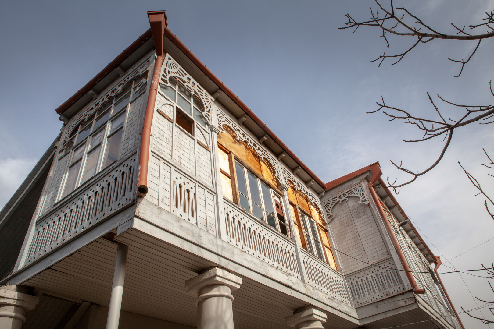 A two-storey house of irregular design is somewhat deeper from the street line and is bordered by a stone and brick fence. The main artistic accent of the building is an openwork wooden balcony, which is placed on several facades and supported by square and round brick pillars, whose ornamental repertoire reflects Art Nouveau style. At the beginning of the last century, a wooden balcony was added to the building. Due to its location, scale and space-planning composition, this building plays an important role in the formation of adjacent development.