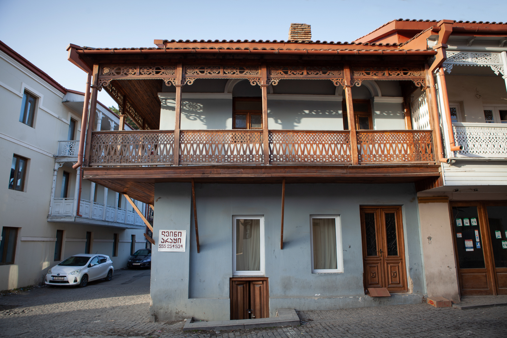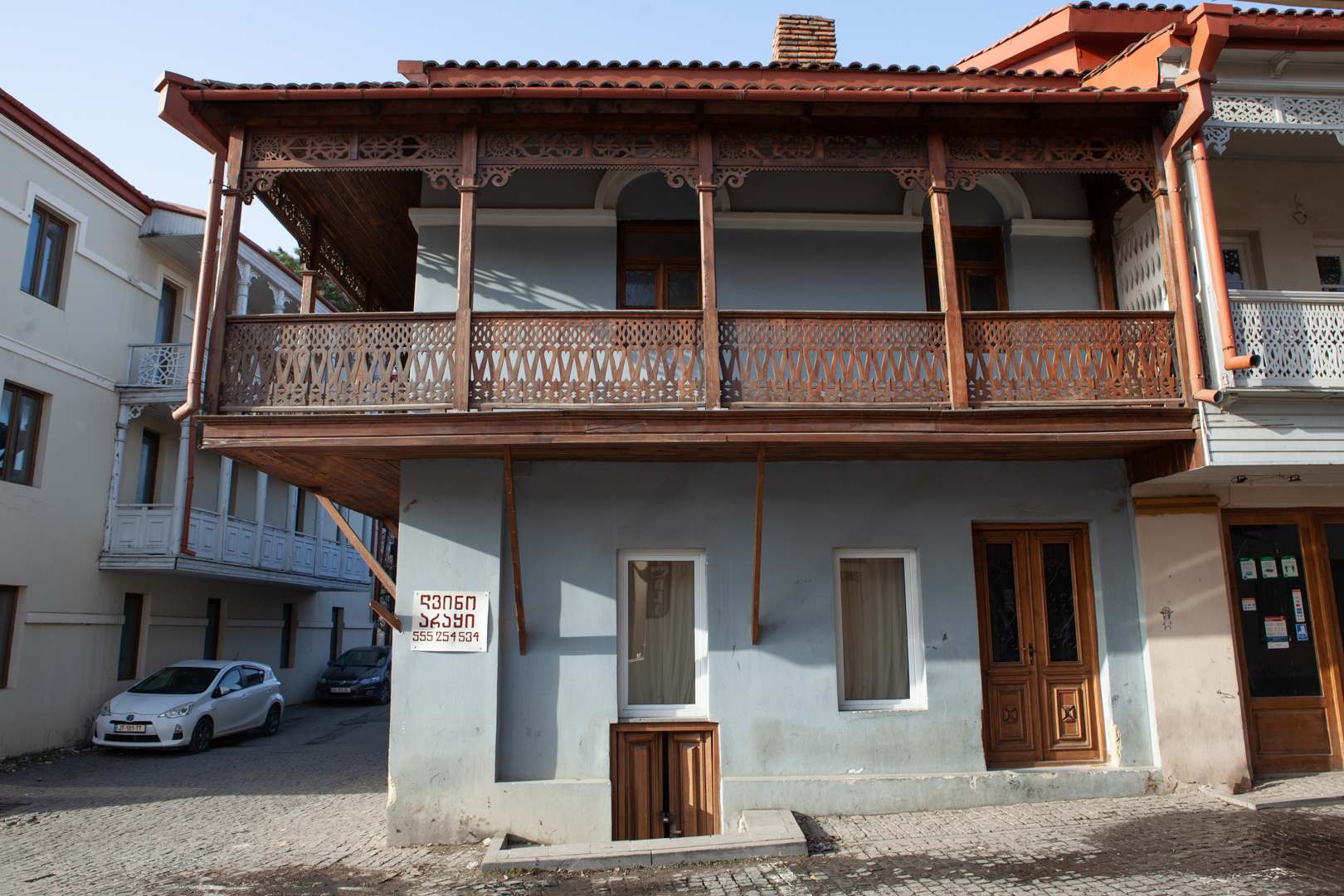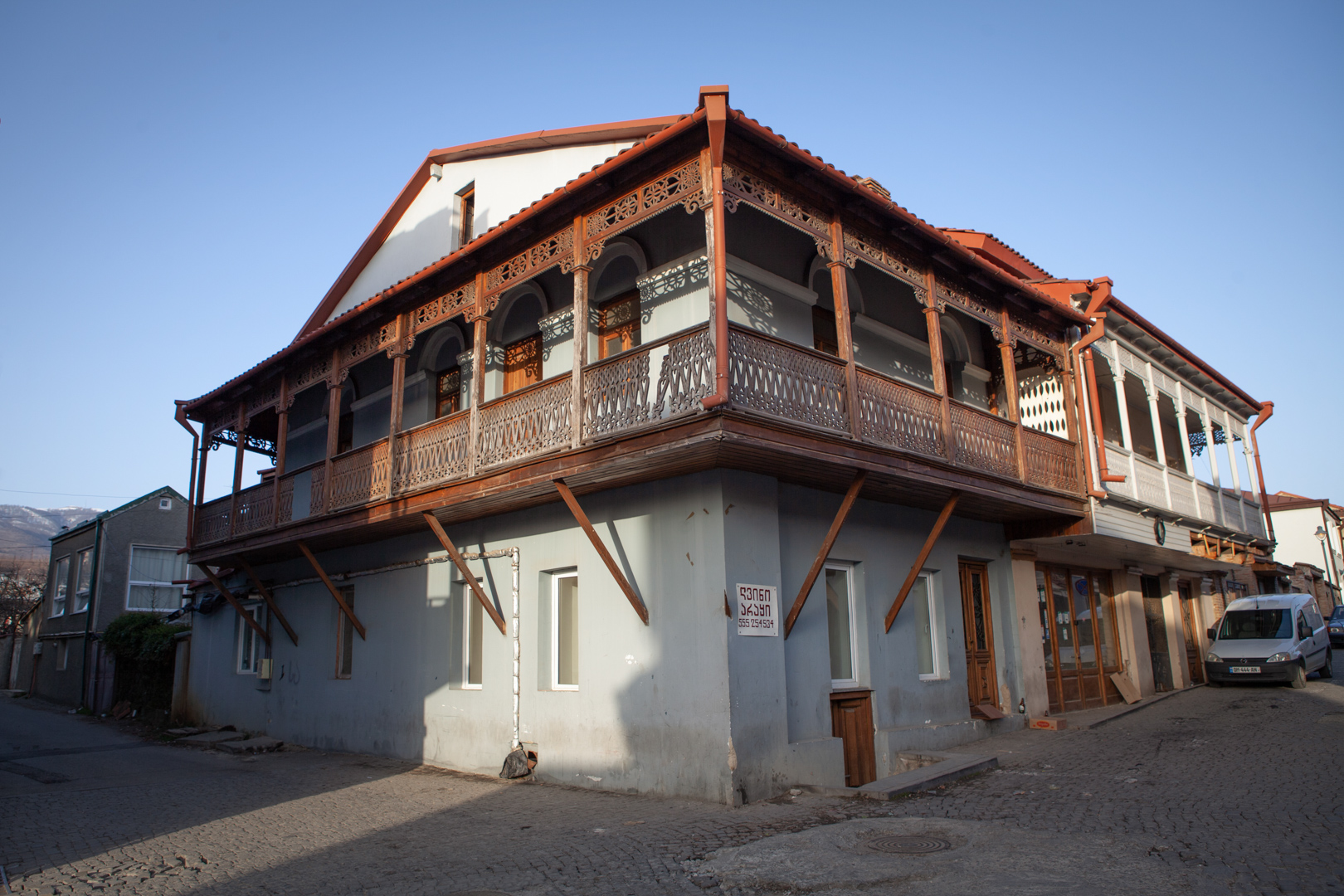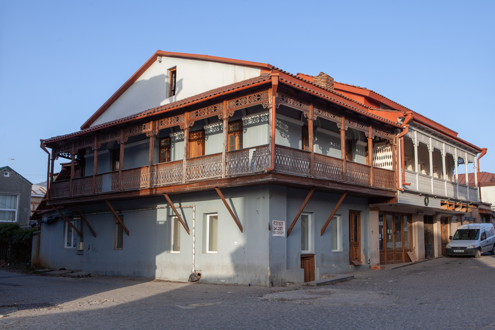 A two-storey plastered brick house at the intersection of two streets has a wooden lathed balcony. In the interior of the house, a characteristic element of an old Telavi dwelling has been preserved – built-in closets and cupboards. Built at the end of the 19th century, the building, with its location, scale and structure, largely determines the adjacent development. Consequently, a houseis important from an urban planning point of view, since with its space-planning characteristics it plays a formative role in the development of the microdistrict.