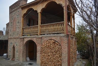 The so-called “Vakhvakhiant Fortress” is one of the three historical fortresses, which is included in Telavi’s development. After the loss of the function of the fortress, its towers were used as dwellings. At the end of the 19th century, on one of the towers, a compact, graceful proportions, two-story brick and cobblestone house was built. At the end of the 19th century, a compact two-story brick and cobblestone house of graceful proportions was built on one of the towers. The circular volume of the castle-tower is divided from the inside into two floors and converted into living rooms. The main part of the first floor is open with a brick arch from the side of the courtyard; and one of its walls attracts attention with a decorative masonry of brick and cobblestone. This wall decorates a window and a door with pointed arch and semicircular frame. The facade is finished with a decorative parapet. The second floor butifies a three arched wooden balcony and openwork railings (renewed recently). Along with the historical value, the urban load of the tower is important, as it is actively involved in the historical landscape of Telavi.